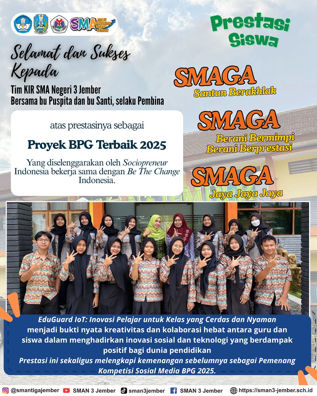 SMA Negeri 3 Jember terus berinovasi dalam mewujudkan pembelajaran abad ke-21 yang mengintegrasikan sains, teknologi, dan empati melalui proyek unggulan bertajuk EduGuard IoT (Internet of Things).