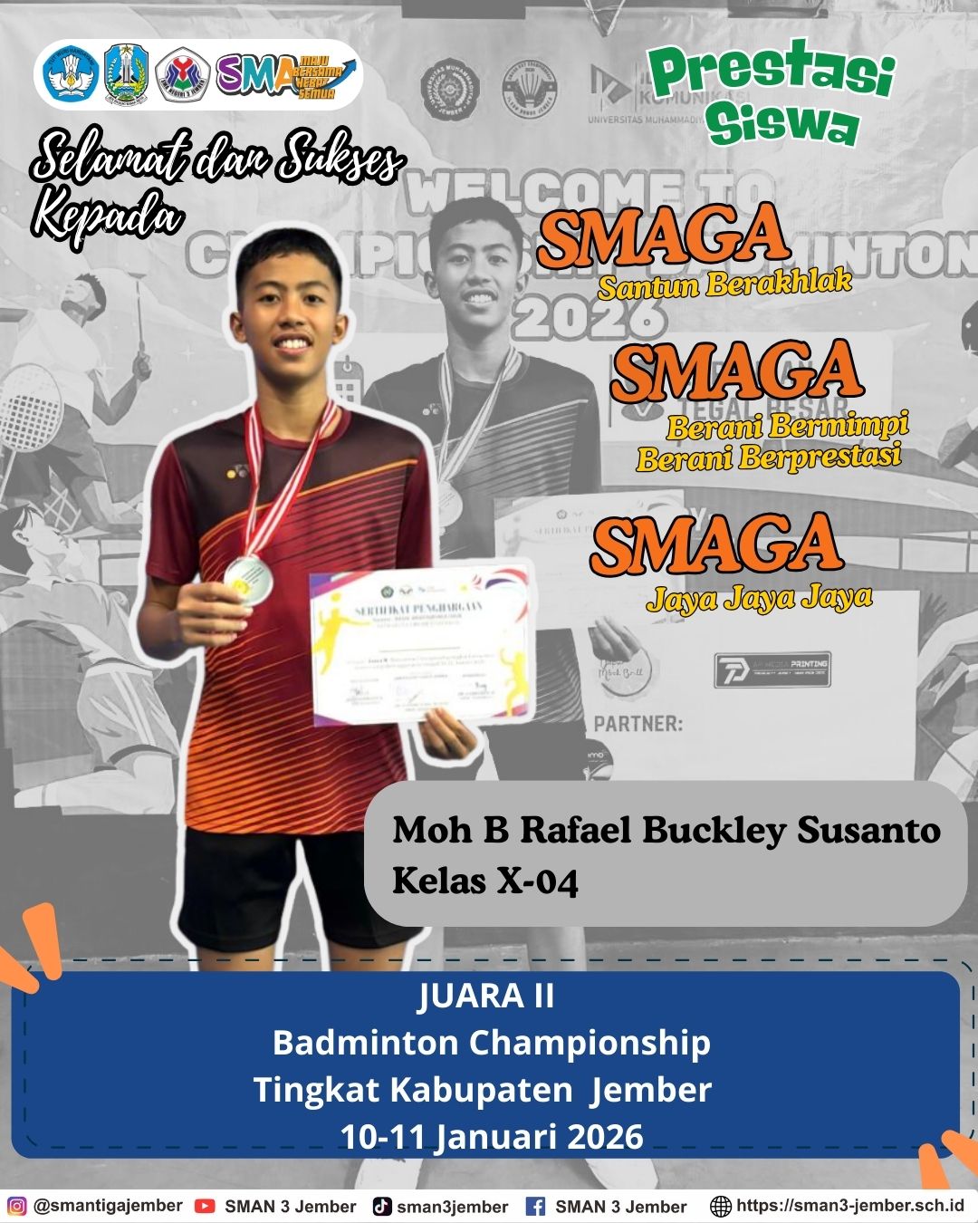 Moh. B.Rafael Buckley Susanto kelas X – 04, Juara 2 Badminton Championship Tingkat Kabupaten Jember pada tanggal 10 – 11 Januari 2026.