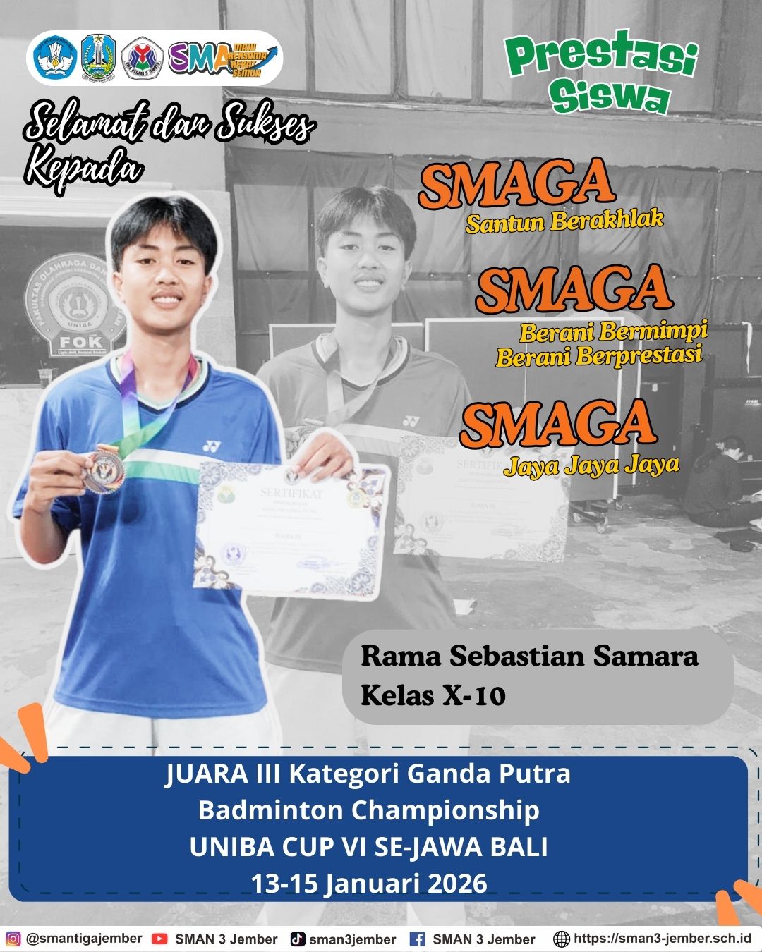 Rama Sebastian Samara Kelas X – 10, Juara 3 Kategori Ganda Putra Badminton Championship yang diselenggarakan oleh UNIBA CUP VI SE -JAWA BALI pada tanggal 13 – 15 Januari 2026.