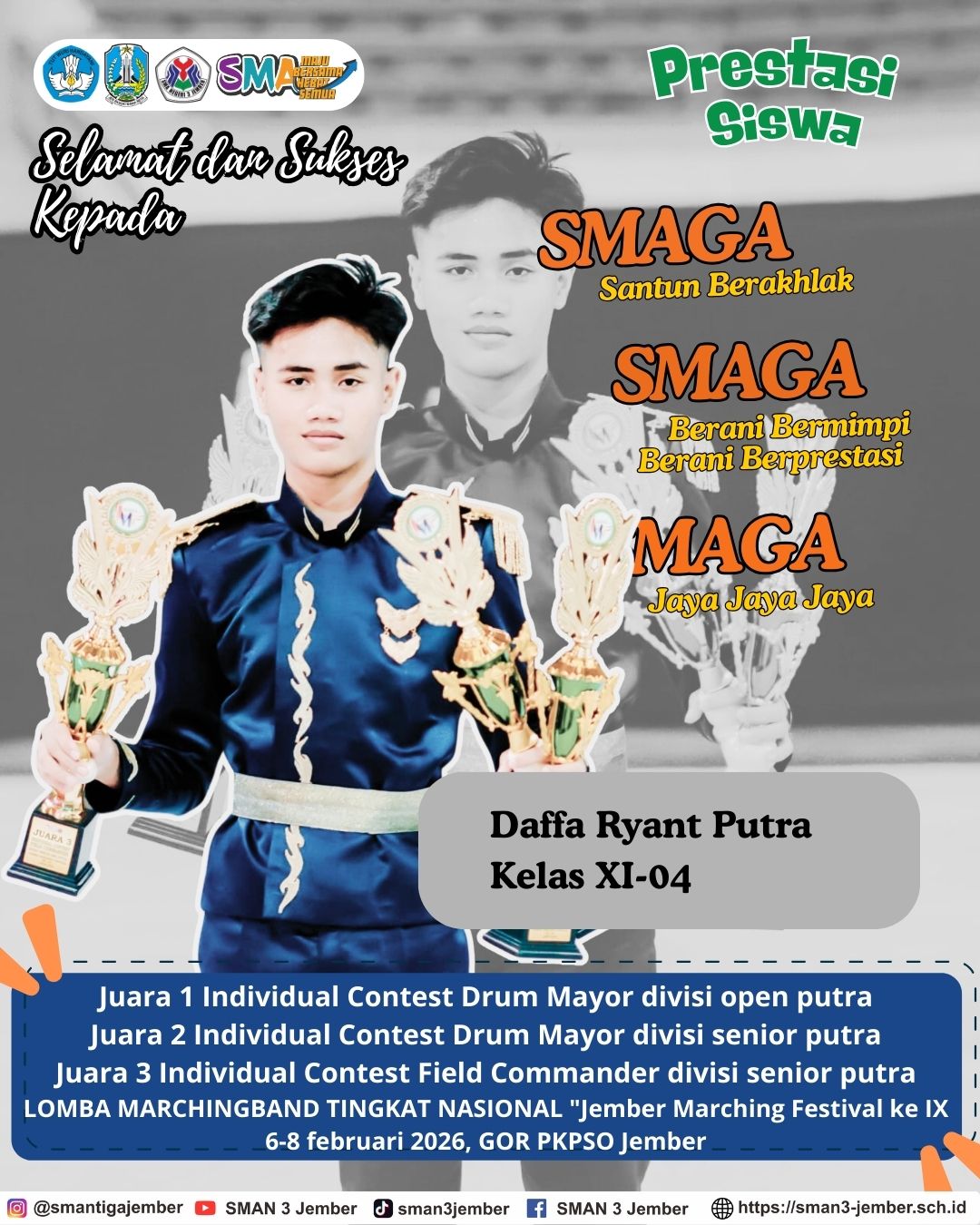 Dalam lomba marchingband tingkat nasional “Jember Marching Festival ke IX tgl 6-8 februari 2026,di GOR PKPSO Jember. Selamat dan sukses atas pencapaian yang luar biasa! Keberhasilanmu adalah cerminan kerja keras dan dedikasi yang tinggi terhadap diri dan almamater tercinta. Semoga dukungan, doa dan harapan terbaik selalu mengiringi langkah kalian.
