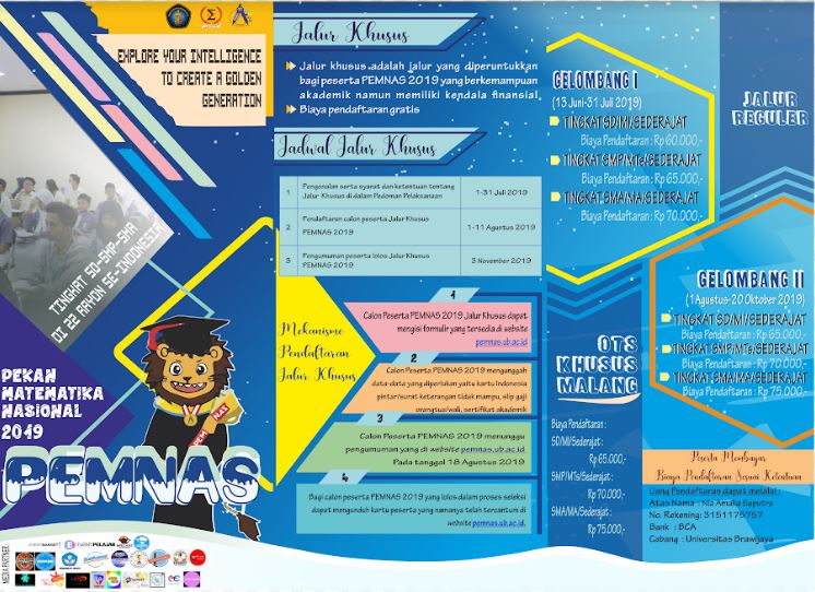 Himpunan Mahasiswa Matematika (HIMATIKA), Jurusan Matematika, Universitas Brawijaya menyelenggarakan Pekan Matematika Nasional 2019 (PEMNAS) tingkat SD,SMP,SMA sederajat yang akan dilaksanakan di 24 rayon di seluruh Indonesia.